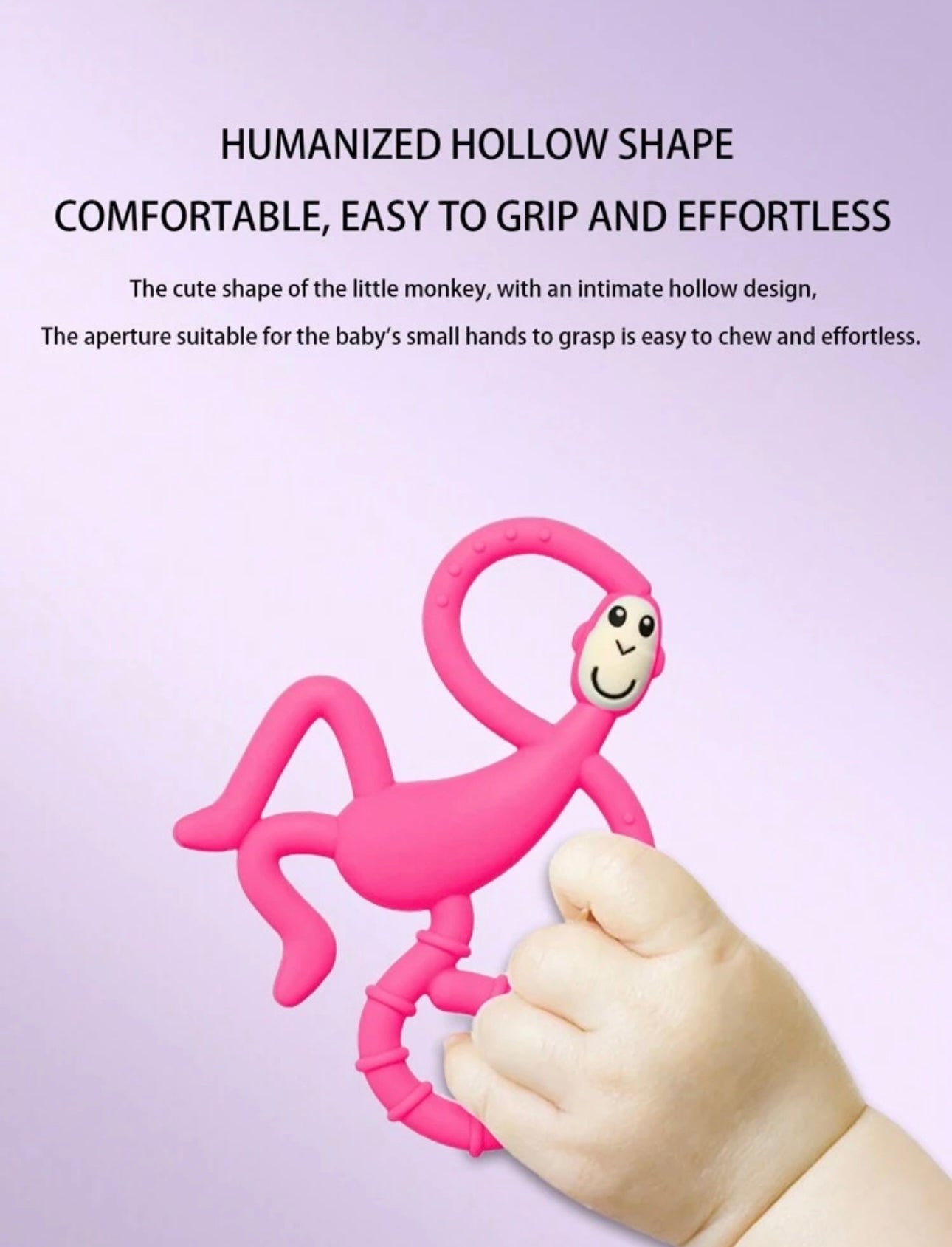 - **Fröhliches Design:** Der Beißring zeigt eine lustige Affenfigur in einem lebendigen Pinkton, die die Aufmerksamkeit Ihres Kindes auf sich zieht und zum Spielen anregt. Die freundliche Gesichtsausdruck des Affen sorgt für zusätzliche Freude.